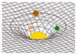 El fenómeno de gravitación, originalmente descrito por Newton como la fuerza que atrae a los cuerpos según su masa, fue abordado por Einstein con una perspectiva fuera de serie.Para Einstein, el espacio también es una forma de energía, que a pesar de ser invisible (energía obscura), se puede curvar por influencia de la masa y hasta la luz se desvía por efecto de la curvatura. Cuando determina esto, concluye que la fuerza de gravedad es efecto de una depresión del espacio que fuerza los cuerpos a caer por la pendiente de dicha deformación. A mayor masa, mayor es la deformación y así la pendiente. Además, si la masa gira produce una torsión del espacio, cosa probada por la NASA en 2011.